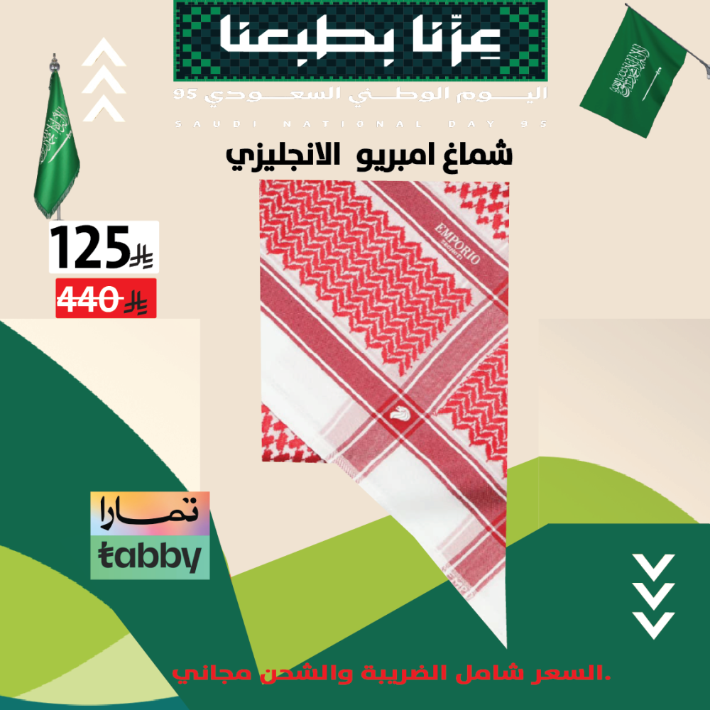 تألق بهيبه وفخر لا مثيل لهما مع شماغ امبريو دم الغزال، الذي يتميز الآن بخصم يصل إلى 60%، مع إمكانية الحصول على شحن مجاني وتقسيط الدفعات عبر تمارا، والذي يصلك أينما كنت بجودة استثنائية عالية وتصميم عصري يعكس ذوقك الرفيع، ندعوك لاكتشاف الأناقة والهيبة اللا متناهية، حيث يتمازج الفخامة برونق شماغ دم الغزال الفريد الذي يضيف لكل لحظة طابعاً خاصاً، إنه الخيار الأمثل كافضل شماغ احمر رجالي لهذا العام.